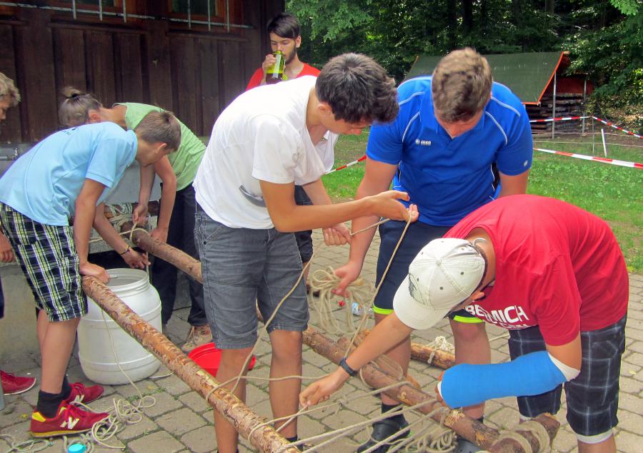 Am Samstagmorgen war der Regen vorübergezogen und wir wurden von Sonnenstrahlen geweckt. Nach dem Frühstück konnten wir in Workshops entweder Freundschaftsbändchen knoten, neue Fähigkeiten in der ersten Hilfe erlernen, Lederbeutel basteln oder bei beim Lagerbauten-Workshop eine Schaukel errichten.